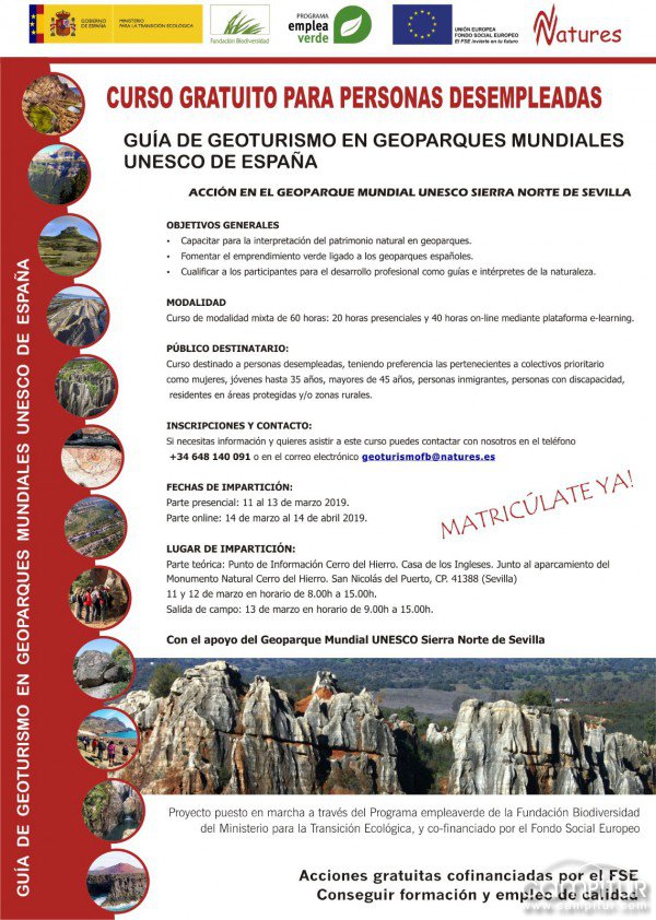 Con el objetivo de conseguir formación y empleo de calidad, se va a llevar a cabo la impartición de un curso gratuito para personas desempleadas para formarse como Guía de Geoturismo en Geoparques Mundiales Unesco de España.