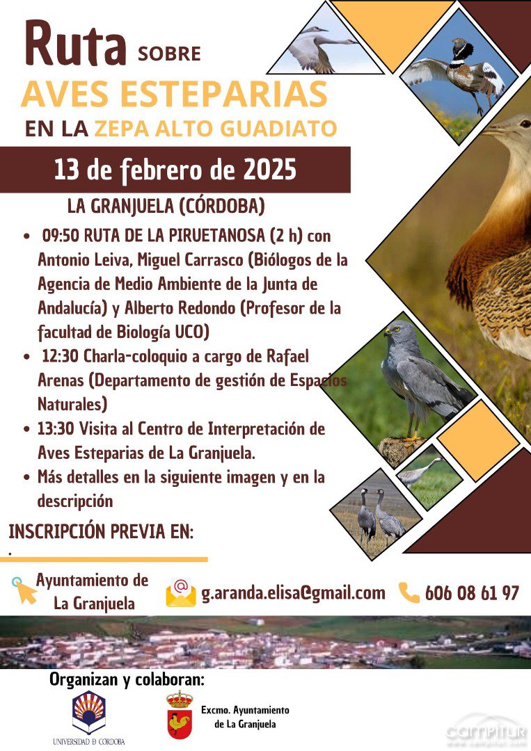 El próximo 13 de febrero de 2025, la localidad de La Granjuela (Córdoba) acogerá una interesante ruta sobre aves esteparias dentro de la Zona de Especial Protección para las Aves (ZEPA) Alto Guadiato. Esta iniciativa, organizada por la Universidad de Córdoba y el Ayuntamiento de La Granjuela, tiene como objetivo la divulgación y conservación de estas especies emblemáticas del ecosistema andaluz.