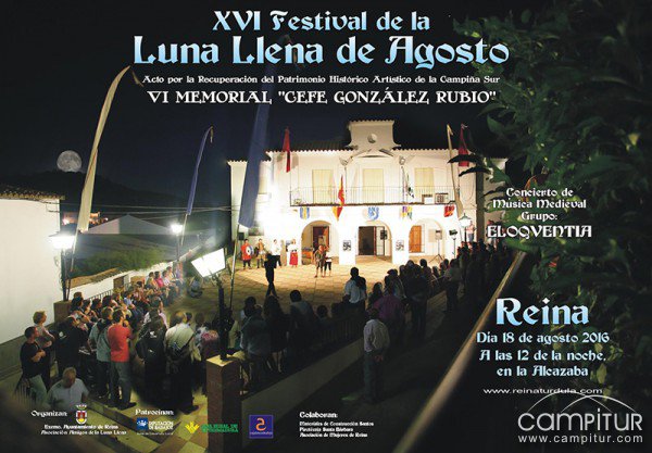 Reina celebra el próximo jueves, 18 de agosto, el “XVI Festival de la Luna Llena de Agosto en Reina”. Acto por la Recuperación del Patrimonio Histórico Artístico de la Campiña Sur. VI Memorial “Cefe González Rubio”